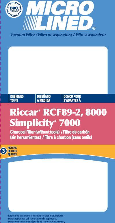 Designed to fit Riccar 8000 series upright vacuums. Also, fits Simplicity series 7 vacuums. Charcoal filtration Package contains 3 filters OEM #RCF89-2
