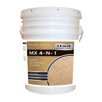 MX 4N1 is specially formulated high performance product composed of low foam detergents, sequestering agents and water soluble solvents. Formulated to provide maximum cleaning action in hot and cold water extraction units without leaving residue behind. Meets the highest standards in carpet extraction maintenance. Approximately 80% of all soils and greasy substances are caused by foot traffic and over half are of a greasy nature. Safe on all synthetic carpet fibers. Does not contain any optical brighteners. This product is an extraction cleaner that cleans the carpet fibers more thoroughly than any product on the market today. This product is most effective on carpets that have been previously treated with a mill-applied fluorochemical stain-resistant treatment. Vacuum carpet thoroughly. Test carpet for colorfastness in an inconspicuous area before any method of cleaning.