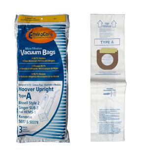 Generic micro filtration paper vacuum bags, manufactured by EnviroCare, designed to fit Hoover upright vacuums accepting style A bags. Also, fits Bissell Style 2, Singer SUB-3 / HEMS-1 and Kenmore 5037 / 50378 model vacuums. These Hoover Style A Vacuum Bags by Envirocare features enviro-closure for a clean and easy replacing process. Bag filtrate 99.7% of microscopic particles and allergens. EnviroCare's filtration efficiency offers a cleaner home environment and are a must have for allergy sufferers!