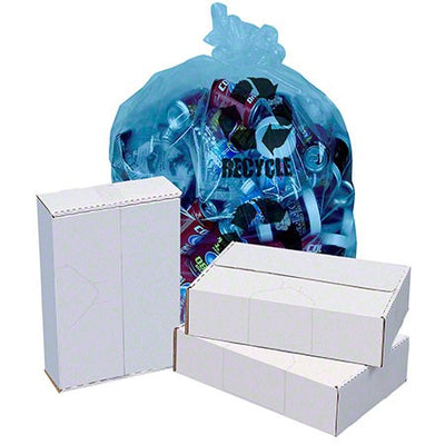 Recycling bags are ideal to hold recyclables included in bag-based municipal curbside recycling programs. They are convenient to use to transport recyclables to community programs, and are strong enough to store a variety of heavy recyclables. The bags are blue in color and clearly printed with the recycling symbol to differentiate them from regular trash. Maximum film strength. Puncture and tear resistant. Blue tint with printed recycling symbol