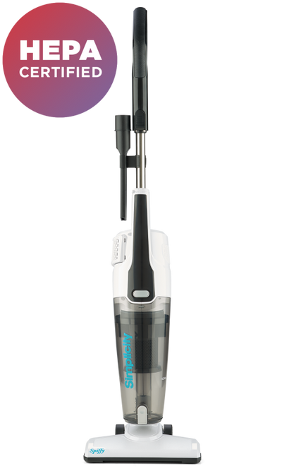 Simple but powerful, the Spiffy makes it easy to clean bare floors and area rugs, and even stairs. At just 7 pounds, it's easy to lift, easy to clean and easy to empty for the next use. Spiffy has a powerful 9 amp motor and two speeds. It's bagless but is eqipped with four stage filtration including a HEPA media filter. A Deluxe Touch handle grip makes it easy to use. Its nozzle is slim and narrow, making it easy to clean under cabinets and between furnishings. With rubber wheels, a cushy furniture guard around the nozzle and a squeegee for spotless bare floor cleaning, the Spiffy will quickly become your best friend for quick clean ups!